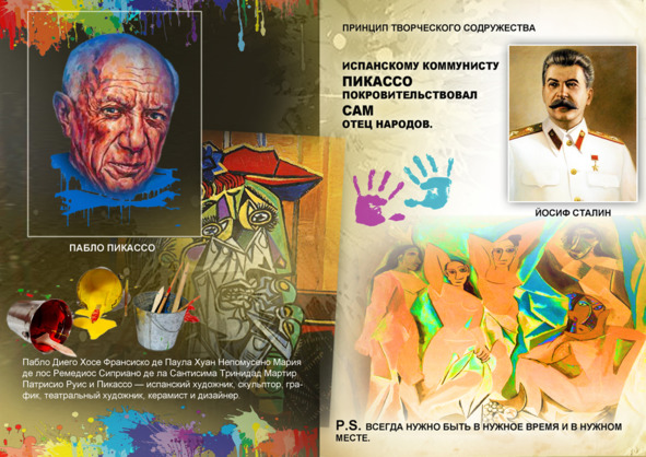 Па́бло Дие́го Хосе́ Франси́ско де Па́ула Хуа́н Непомусе́но Мари́я де лос Реме́диос Сиприа́но де ла Санти́сима Тринида́д Ма́ртир Патри́сио Руи́с и Пика́ссо – испанский художник, скульптор, график, театральный художник, керамист и дизайнер. Пикассо, за его политическое кредо, покровительствовал сам отец народов, Сталин.