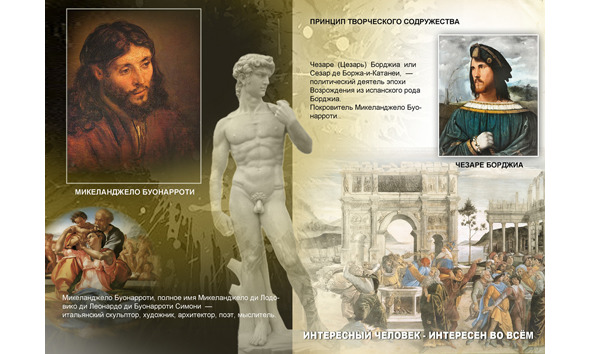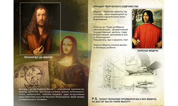 Леонардо ди сер Пье́ро да Ви́нчи – итальянский художник-живописец, скульптор, архитектор и учёный, анатом, естествоиспытатель, изобретатель, писатель, музыкант. Один из крупнейших представителей искусства Высокого Возрождения, яркий пример универсального человека. Лоре́нцо ди Пьеро де Ме́дичи «Великоле́пный» флорентийский государственный деятель, глава Флорентийской республики в эпоху Возрождения, покровитель наук и искусств, поэт, спонсор великого Леонардо да Винчи.