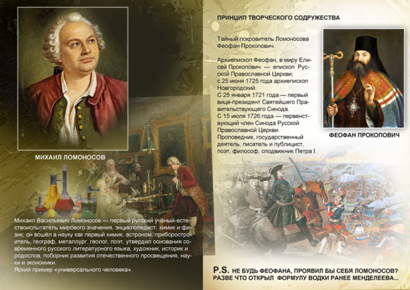 Михаи́л Васи́льевич Ломоно́сов – первый русский учёный-естествоиспытатель мирового значения, энциклопедист, химик и физик. Он вошёл в науку как первый химик, астроном, приборостроитель, географ, металлург, геолог, поэт. Утвердил основания современного русского литературного языка, художник, историк и родослов, поборник развития отечественного просвещения, науки и экономики. Тайный покровитель Ломоносова Феофан Прокопович.
