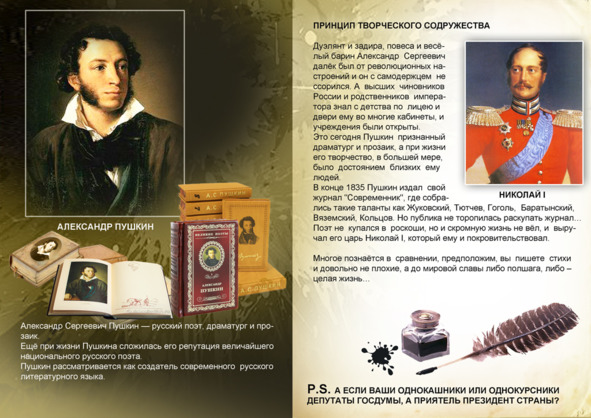 Дуэлянт и задира, повеса и весёлый барин Александр Сергеевич далёк был от революционных настроений и с самодержцем не ссорился. А высших чиновников России и родственников императора знал с детства по лицею и двери ему во многие кабинеты, и учреждения были открыты. Многое познаётся в сравнении, предположим, вы пишете стихи и довольно не плохие, а до мировой славы либо полшага, либо – целая жизнь… А если ваши однокашники либо однокурсники депутаты Госдумы, а приятель президент страны, получите ли вы известность? Сверх меры.