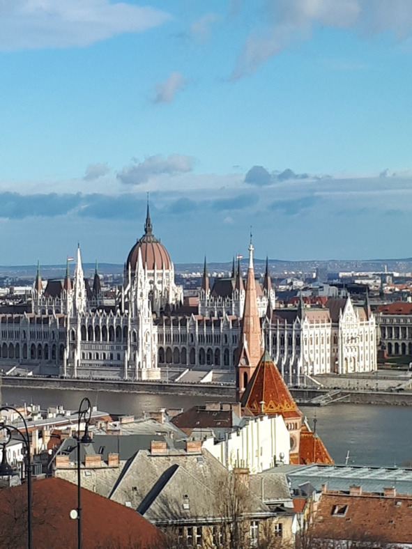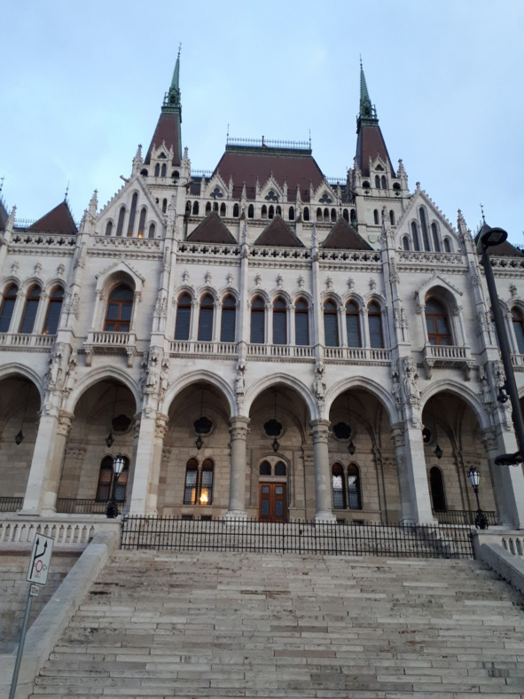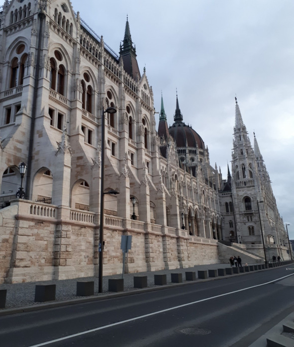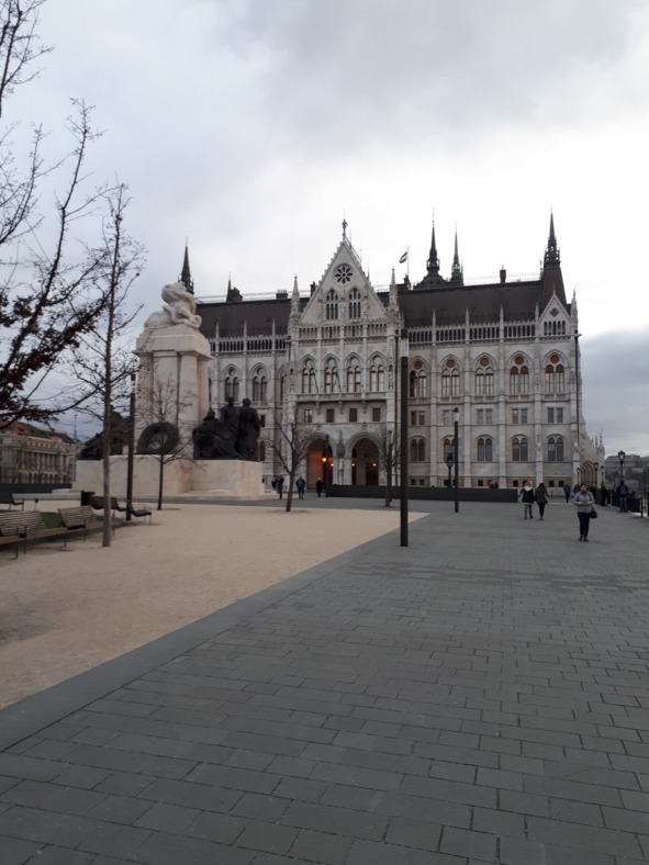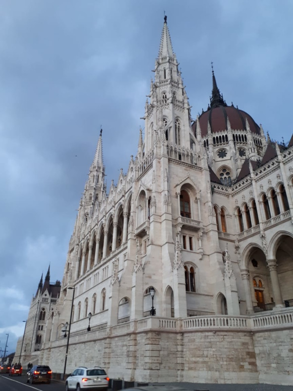 – непревзойдённое строение со множеством башен и исключительно своеобразным набором символов – оберегов. Выдающееся творение мастеров строителей. Здание под защитой сверху и со всех сторон каменными охранниками – зоркими химерами и кугуарами с копьями в лапах. На площади у парламента всадник на коне, с другой стороны – река Дунай, на следующей стороне лев на постаменте давит змея. С внутренней стороны за парламентом простирается город Пешт.