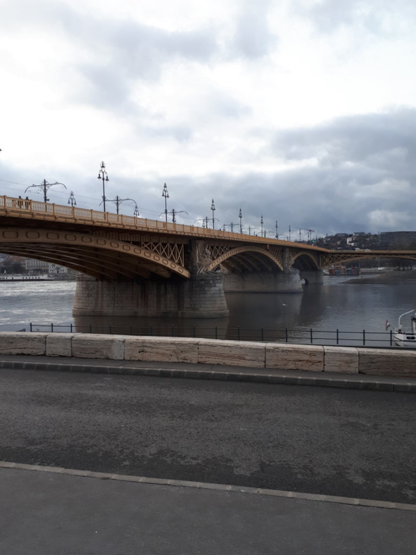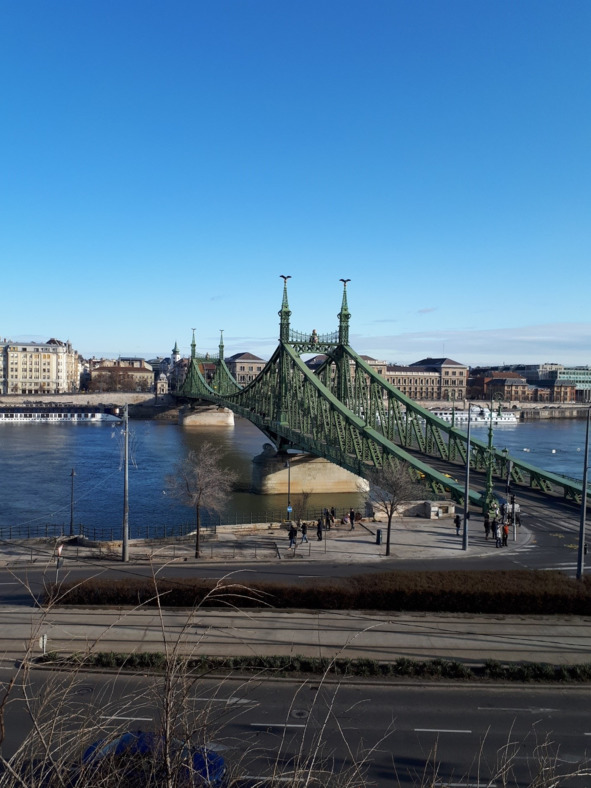 находящийся в жилом доме с внутренним двориком. Через дорогу от входа подножие белого моста, соединяющего берега Дуная.