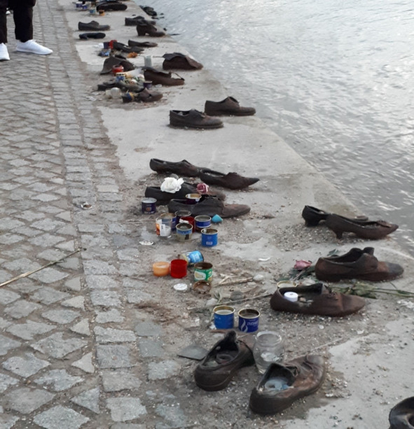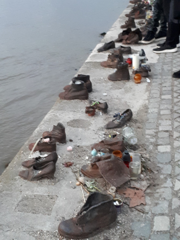 На мраморном прямоугольном кантике набережной Дуная увековеченная обувь, туфли, ботинки вперемешку в ряд – это скорбный знак памяти о погибших евреях. В годы второй мировой войны нацисты связывали верёвкой выстроенных в цепь евреев. Сталкивали в воду одного, а остальные падали за ним. В общей связке тонули вместе.