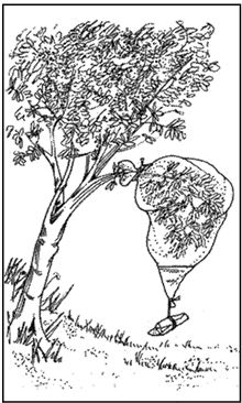 Испарительный мешок (рис. 7). Самый простой способ получения воды. Поместите ветку растения или кустарника в большой чистый полиэтиленовый мешок, горловину мешка завяжите на ветке. К донышку мешка привяжите утяжеление, которое должно оттягивать дно, на котором будет собираться уловленная вода, вниз.