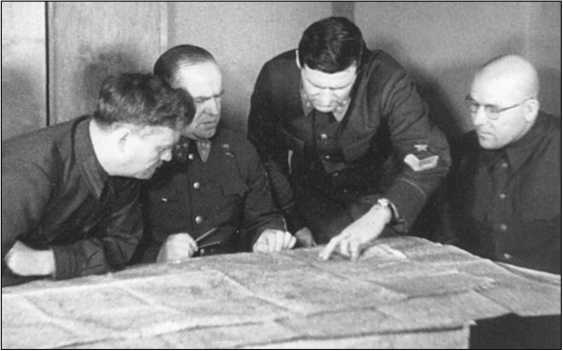 В штабе Западного фронта в конце 1941 г. Слева направо: Н.А. Булганин, Г.К. Жуков, В.Д. Соколовский, И.С. Хохлов.