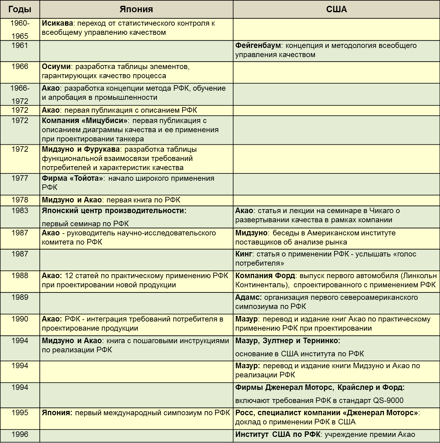 Разработка РФК имеет предисторию [8]. Еще за шесть лет до событий 1972 г. д-р Акао разработал свою концепцию, обучал и вел работы по ее практическому использованию на японских предприятиях. Некоторые из них были довольно успешными, например, на автомобильных фирмах «Hino Motors» и "Toyota Auto Body", но широкую известность они тогда не приобрели.