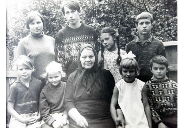 Моя бабуля с нами, внучатами. Это Таня Казачинина, Валера Носорев, Света Сайганова, Коля Казачинин, Света и Галя Казачинины, Наташа Феклинова, Рома Касумов. 1971 г.