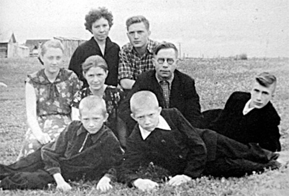 Родители (в центре) и все их дети: Паша (это я), Миша, Вася. Рядом с мамой Вера. Володя – с женой Валей. На лужайке у нашего дома. 1958 г.