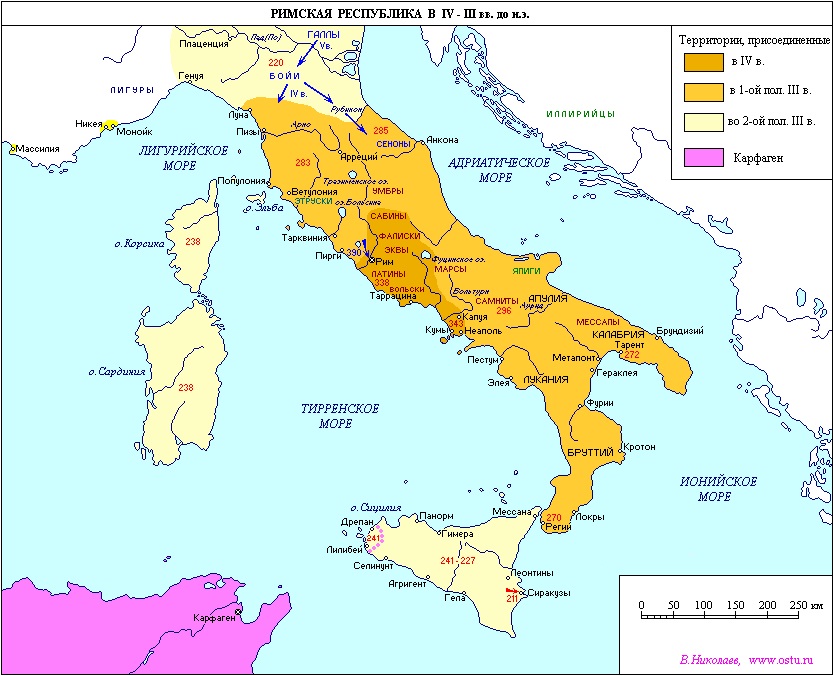 При консулах Публии Сульпиции Саверрионе и Публии Семпронионе Софе [304 г. до Р. Х.] самниты отправили в Рим для переговоров о мире своих послов, чтобы добиваться то ли конца войне, то ли ее отсрочки. На их униженные просьбы был дан ответ: если бы самниты не просили так часто мира, готовясь тем временем к войне, можно было бы вести подобные переговоры; но, коль скоро до сих пор слова оставались без последствий, приходится верить только делам. Скоро консул Публий Семпроний будет с войском в Самнии, и его не обманешь, к войне или к миру склонны самниты; выяснив все, он обо всем доложит сенату, и, когда он двинется из Самния обратно, послы пусть идут за ним следом. В тот год на пути через Самний римские легионы встретили лишь мирных жителей, охотно снабжавших их продовольствием, так что старинный договор с самнитами все-таки возобновили. (Ливий; IX; 1- 45).