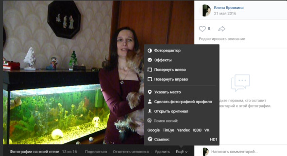 Когда фотография загрузиться, то с ней можно Поделиться, Отметить человека, Удалить, а если нажмем на Еще. то откроется целое меню.