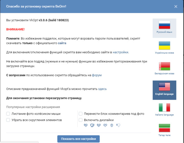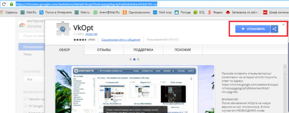 Оно функционирует во всех браузерах. В нем много интересных функций: можно скачать аудио; можно увидеть размеры аудио записей; листать фотографии колесиком мышки; в профиле отобразится возраст и знак зодиака; комментарии будут справа под фотографией; квадратные элементы сайта; удаление рекламы.