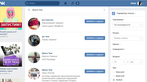 Вы можете сделать сортировку: по рейтингу, региону, указать школу, университет, возраст и т. д.