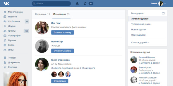 Заходим на свою страничку. Заходим во вкладку Друзья, кликаем на Заявки в друзья, Исходящие. И мы видим, что пока наши заявки не приняты.