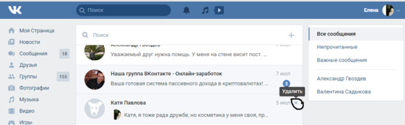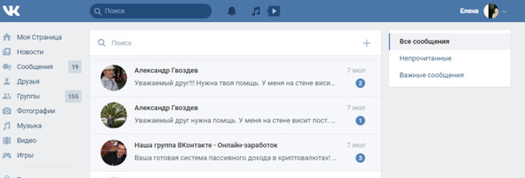 Если Вы ведете переписку, то Вы можете посмотреть Все сообщения, Непрочитанные или Важные.