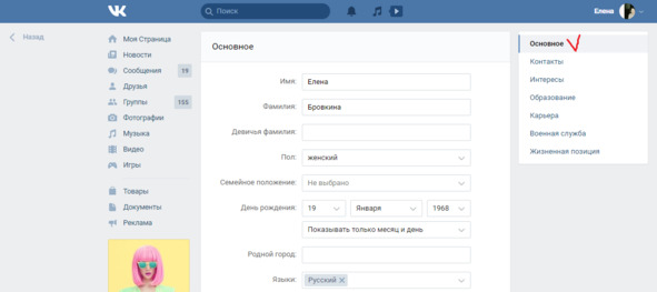 Заходим во вкладку Основное. Здесь Вы заполняете поля, которые Вы считаете нужным.