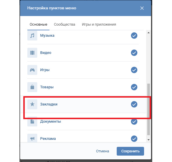 И в настройках Основные. Напротив Закладки ставим галочку. Нажимаем сохранить.