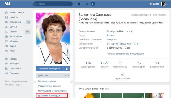 Теперь заходим на страничку нужного пользователя, нажимаем три точки и выбираем Добавить в закладки.