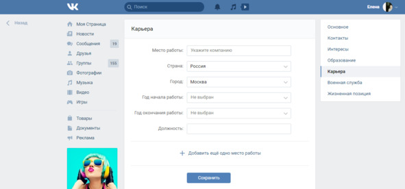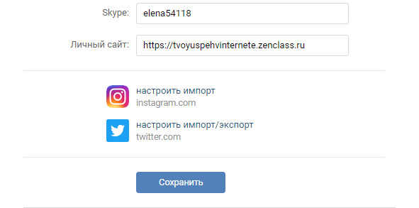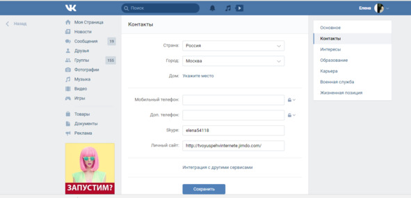 Во вкладке контакты вы тоже заполняете те пункты, которые считаете нужные. И нажимаем Сохранить.