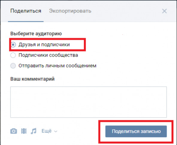 Если кликнем по последнему, то в открывшемся окошке отмечаем Друзья и подписчики. И кликаем Поделиться записью.