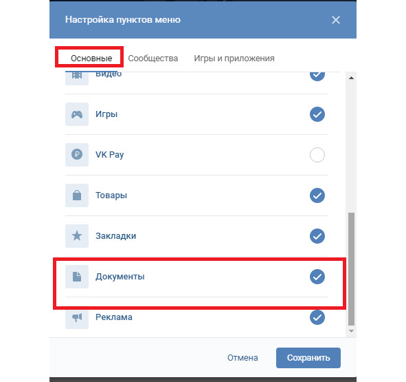 В настройках Основные выбираем Документы и ставим рядом галочку. Нажимаем Сохранить.
