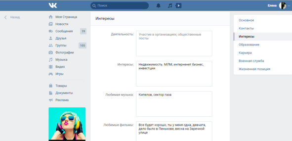 Нажимаем вкладку Интересы. Здесь Вы можете дать информацию в предоставленных категориях.