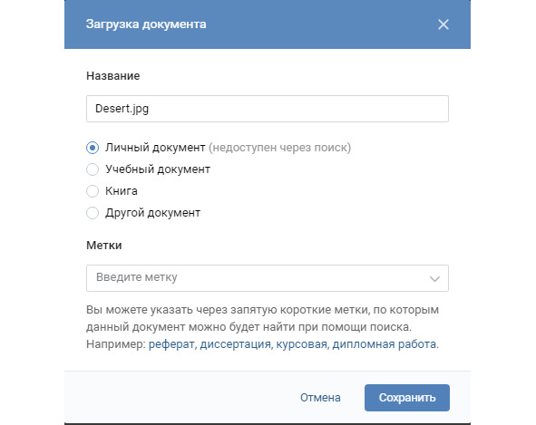 Здесь мы должны дать ему название, тип, если необходимо, то и метки и нажимаем Сохранить.