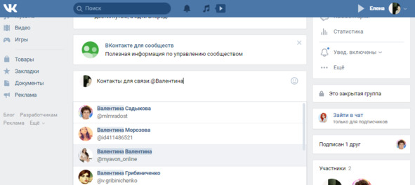Если нет нужного контакта, то после знака «собачка» прописываем скопированный id.