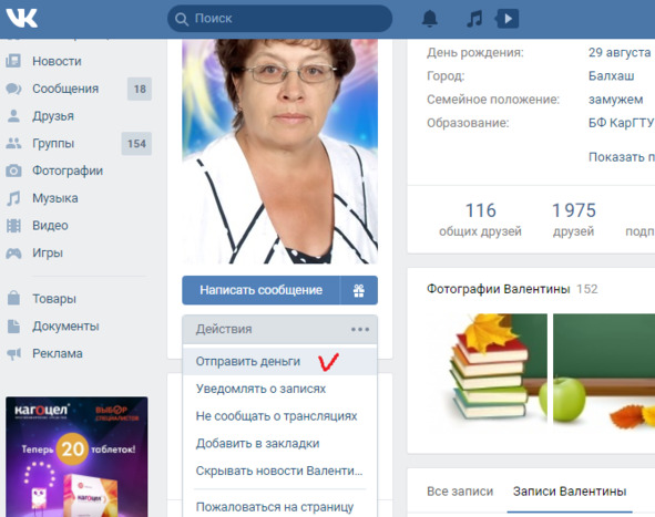 Мы заходим в аккаунт того человека, которому нужно перевести деньги. Нажимаем на три точки и выбираем Отправить деньги.