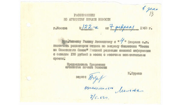 Галина (по тогдашнему паспорту – Милаева, «из семьи служащего») зачислена на работу в отдел выпуска бюллетеня «Вести из Советского Союза» (АПН) с месячным испытательным сроком и окладом в 130 рублей. Проработала там шесть лет, и в характеристике, подписанной председателем правления Б. Бурковым (было подшито к уголовному делу), охарактеризована как «политически зрелая и способная журналистка, чуткий и внимательный товарищ».