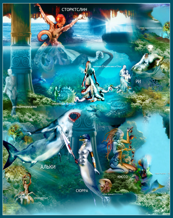 Божество с головой рыбы – Ри. В её владения входили коралловые рифы, создаваемые из рёбер попавшихся к ней океанид и ритей, водных русалок, и прилегающее дно океана. Голова Ри – сообразна морскому окуню. Она проплывала, полулёжа и величественно на белом скате, увешанная тяжёлыми ожерельями из пурпурных кораллов – символ кровеносных артерий рифа, держа в руке большую раковину моллюска-гребешка. Иерархически она подчинялась Альки, вместе с нимфами островов – ритеями. Божеству Ри поклонялись островитяне Атлантиды, занимающиеся подводным промыслом.