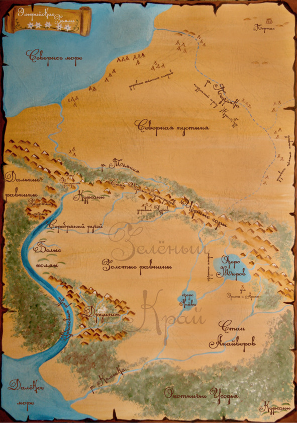 Арина, помимо домашних хлопот и наших совместных прогулок, находит время и для творчества: пишет прозу и стихи, украшает чаши, подносы, полки и столы в доме в стиле Урало-Сибирской росписи – народного промысла России, из которой она когда-то очень давно попала в наш мир. У неё получается очень изящно и красиво и даже у искусных эльфов её расписные изделия пользуются спросом. Арина расписала прекрасными узорами большой сундук, где хранится моё оружие – дары Альвиса. Она иллюстрирует свои книги, что также привлекает в наш дом гостей – эльфы любят рассматривать рисунки. В её творчестве есть душевность, притягательность и свой взгляд на мир, в том числе на мир, не ведомый многим обитателям Эльфийских Земель – мир людей. Сам-то я далёк от искусства – мало что могу красиво нарисовать или сочинить. Но очень люблю наблюдать за Ариной, когда она неторопливо и вдумчиво пишет кистью очередное своё творение, с глубоким внутренним чувством, озарённая лучами солнца, создаёт новую вещь, новую жизнь, новый мир, вкладывая в него частичку своей души. И её душа при этом ничего не теряет, а приобретает новые грани мыслей и чувств. Она – Хранитель Света, как и многие эльфы, призвана в своей жизни создавать и сохранять, любить и направлять, созерцать и запечатлевать в памяти каждую частицу красоты. А красота – во всём, что окружает нас: роса, блестящая в утреннем свете; тёмные грозовые тучи и тёплый ливень; багровые вершины гор на закате и страстная ночь в отблесках костра; игра тивров и бег лошадей; состязания анайверов и танцы эльфов.