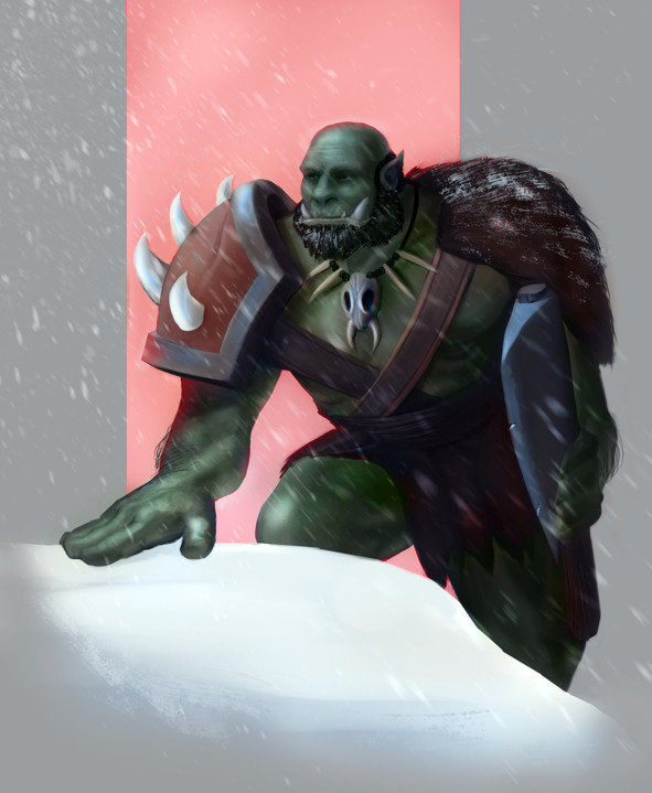 Всего лишь кусок небрежно и неумело, судя по всему, выкованной железной пластины, державшейся на такой же грубой и неаккуратно сделанной цепи, накинутой на оба плеча. Тем самым он защищал переднюю часть туловища. Один наплечник на правом плече, что говорило о том, что этот воин – левша. Той же самой грубой работы две соединенные пластины, державшиеся на кожаном плетении, плотно обмотанном вокруг руки. Судя по рукояти, выглядывавшей из-за спины, вооружен он был большим двуручным топором либо молотом. Сам же всадник выглядел довольно устрашающе: зеленая кожа, большая мышечная масса и лицо, которое удалось рассмотреть, когда он приблизился. В глаза сразу бросались его два выпиравших уродливых клыка по кроям нижней челюсти, шрам через все лицо, зашитый не везде, волосы с двумя толстыми плетеными косами и привязанными к ним различными косточками, бусами, веревками, а на конце одной косы – привязанный давно уж высохший череп, используемый, по всей вероятности, либо как трофей, либо как талисман. Так подумал Багро.