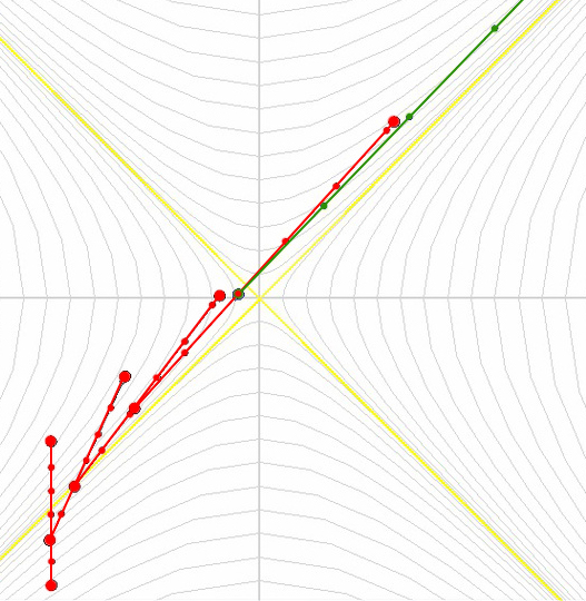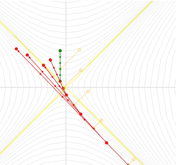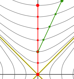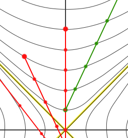 Рисунок 7 Объект (Зелёный) отсоединился от корабля (Красный) в пространсве Минковского для Мегамира