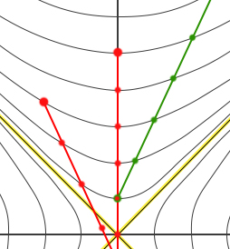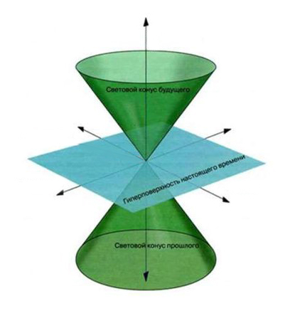 … Для того, чтобы показать наглядно, недостаточно иметь 2Д чертёж. Требуется сделать из него три измерения. Пространство Минковского – это слоёный торт из пространства и времени. Ось времени пронзает каждый слой во всех точках одновременно, допустим снизу-вверх, как привычно для научного мира. И вычисления зависят только от начальной точки в Эвклидовом пространстве.