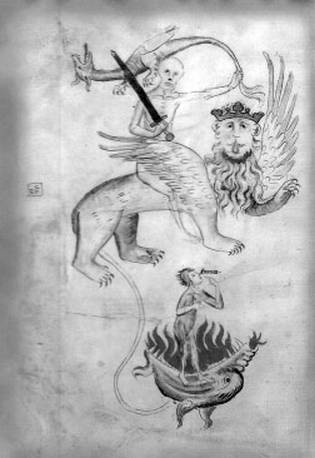Рис. 1. Изображение ада и голода в книге Апокалипсиса рукописной Библии для бедных (Biblia Pauperum), вышедшей в Эрфурте в годы Великого голода.