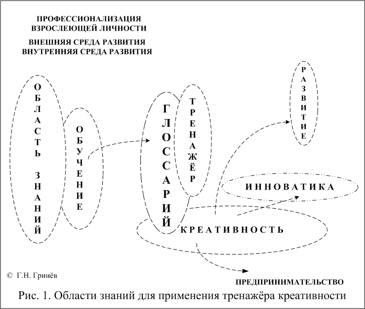 О чём нижеследующий текст – представлено на рис. 1. В школе или ВУЗе изучаются отдельные многочисленные предметы из общей базы знаний. Происходит обучение, каждая область знаний имеет устоявшиеся термины – глоссарий. Ниже по тексту будут описаны технологии работы с глоссарием для тренировки креативности. Эти навыки пригодятся в профессиональном развитии, инноватике, предпринимательстве.
