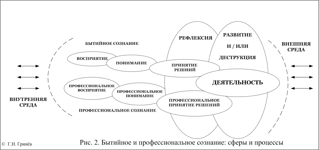 Внутренняя среда личности подробнее рассматривается в разделе ниже по тексту. Бытийное сознание формируется после рождения, а в юности, как правило, уже сформировано, и далее по жизни корректируется в зависимости от окружающей действительности. Бытийное сознание – восприятие, понимание, принятие решений и деятельность – рефлексируется (подвергается внутреннему осмыслению), корректируется, включается как опыт в развитие, но может подвергаться и деструкции, разрушению. Деструкция – влияние на сознание внешних факторов или воздействие на личность (осознаваемое, но чаще неосознаваемое) будут рассмотрены ниже по тексту. Профессиональное сознание формируется на базе бытийного сознания, но значительно позже по времени. Оно формируется в процессе обучения и профессиональной деятельности.