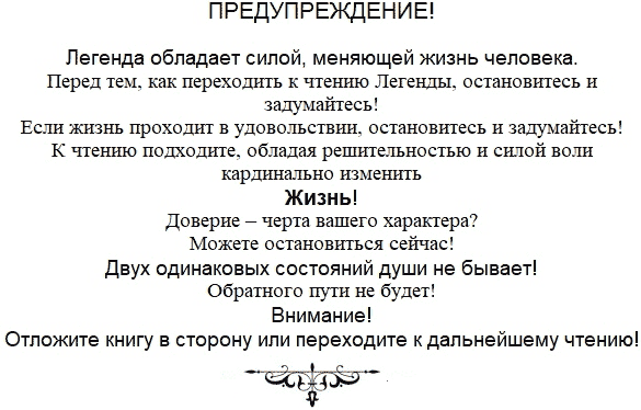 Легенда оберегает вас! Войдите в состояние главных героев и применяйте модели сложившихся взаимоотношений в реальных ситуациях вашего настоящего. Путешествие по стране легенд матрица состояний, лучше пройти в роли, выбор которой произошел от сердца! В далеком прошлом узнайте себя, друга или любимого человека. Прислушайтесь к разуму сердца и поймите, что нужно открыть в себе, какие грани души, чтобы сознание начало транслировать в мир мысли, самые правильные из которых, укажут путь к тому единственному, кто станет другом и любимым человеком. Определитесь с направлением мыслей, чтобы знать, какие состояния незнакомы, какие состояния неприемлемы? Что необходимо сделать, чтобы изменить настоящие состояния? Какое состояние мешает на пути к пониманию себя, на пути к взаимопониманию в вашем окружении или обществе, чтобы отношения стали лучше, ярче? Какие черты характера потеряли, какие убеждения являются ложными и навязанными? В этой Легенде совершите путешествие в мир, который является образцом для всех предыдущих поколений человека, в те отношения, которые помогли стать человеку доминирующим живым существом на планете Земля.