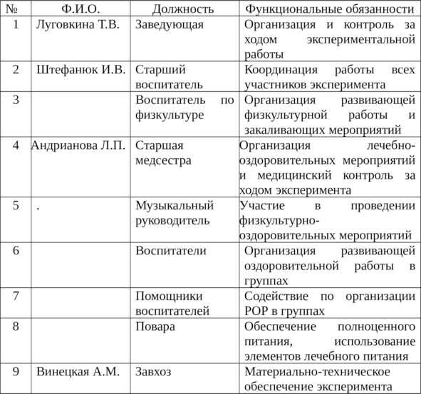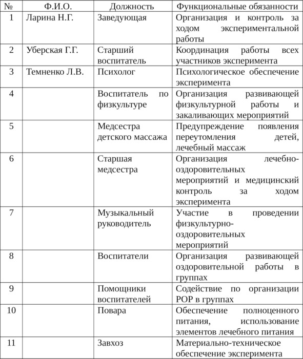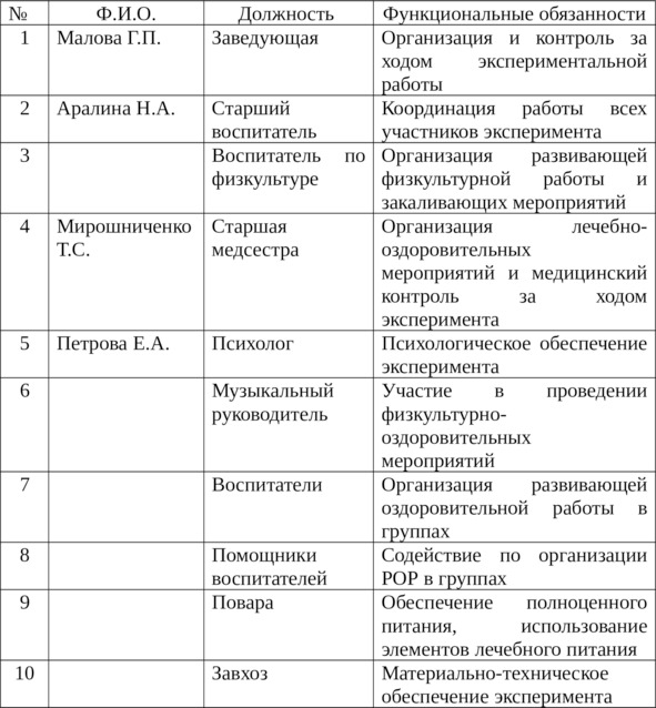 – Дополнительное штатное расписание и функциональные обязанности участников экспериментальной работы