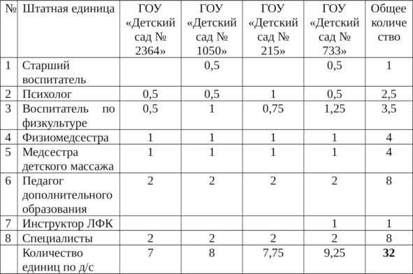 Старшая медсестра – организация и проведение лечебно-профилактической работы в детском саду; организация и контроль за закаливающими процедурами, медицинский контроль за ходом экспериментальной работы.