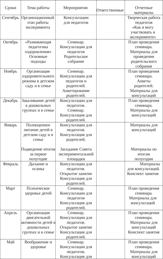 1. Создавать условия для проведения экспериментальной работы по проблеме «Организация развивающей оздоровительной работы с детьми дошкольного возраста».