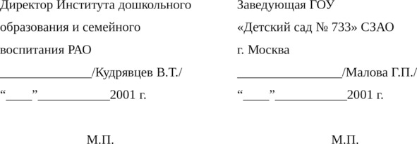 Настоящий договор заключен между ГНИУ Институтом дошкольного образования и семейного воспитания Российской академии образования, в лице директора доктора психологических наук Кудрявцева В. Т., именуемый в дальнейшем «Институт», и государственного образовательного учреждения «Детский сад №733» СЗАО г. Москва, в лице заведующей Маловой Г. П., именуемый в дальнейшем «Детский сад».