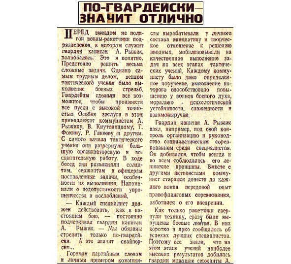 Последний раз я встречался с нашим бравым командиром, капитаном Рыжиком Анатолием Игоревичем, на Московском вокзале в Питере, он мне передал направление в институт, который я благополучно закончил».