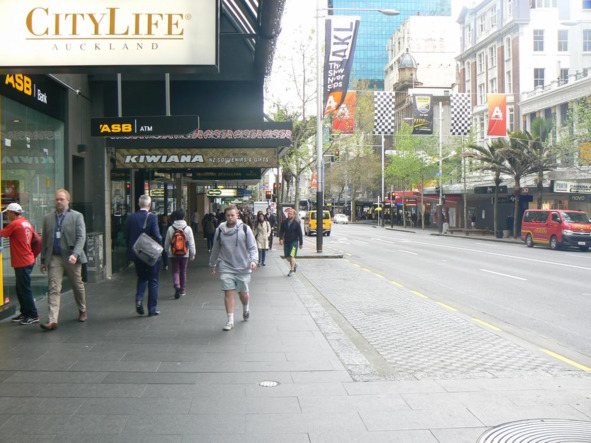 Главный ориентир центра города – телебашня Скай Тауэр. Как оказалось, весь центр очень небольшой, компактный, его исходить вдоль и поперёк можно за считанные минуты. Заблудиться просто невозможно. Уже через 5 минут я был на главной улице Квин Стрит, и стал идти вдоль неё, начиная с номера дома 201, кажется, думая, что до номера 155 я буду идти минут 10. Пройдя минут 7 (на углу услышал русскую речь!), я обнаружил, что прошёл далеко мимо, номера уже были примерно 80—70. Неожиданно… Повернул назад, уже проверяя номера домов: я же гуглил раньше вид улицы и даже, казалось, запомнил даже названия заведений напротив института… И опять прошёл мимо :) И только проходя в третий раз, я разглядел почти закрытый какой-то временной ширмой номер 155.
