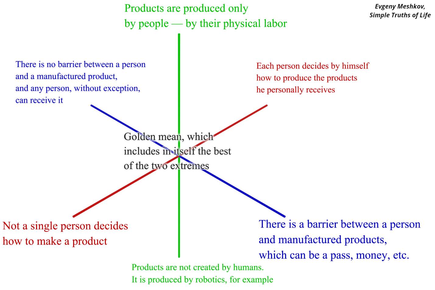 The extreme ways of self-organization of society are depicted in color; they are erroneous and will lead to problems, and people will suffer for their choice to live under such a social structure. In the middle column without a colored background, there are the most correct and reasonable ways of self-organization of society, in which people will not experience the suffering of the two most extreme ways of organizing society. By products, I also mean resources.