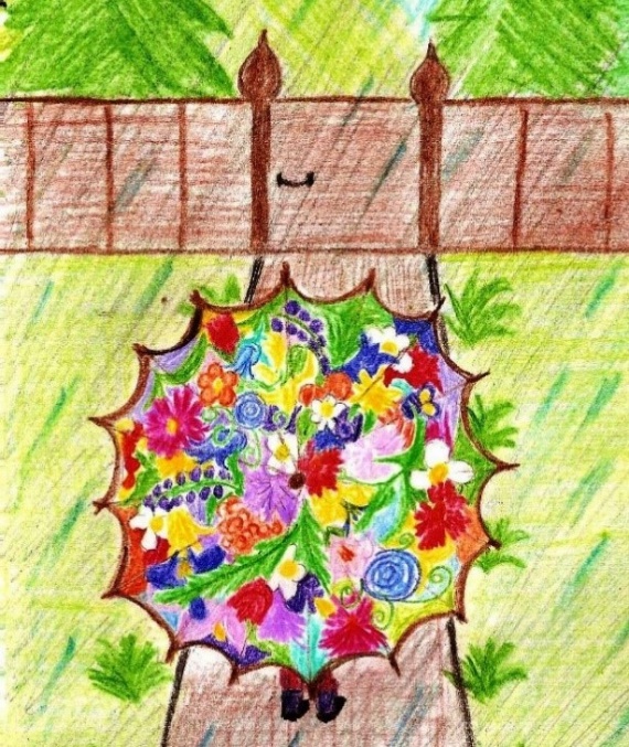 Это был не просто зонт! Он был самым красивым на Земле – так искренне считала Оля. В прошлом году папа привёз его из-за границы маме в подарок. Когда зонт был сложен, он был совсем маленьким и легко помещался в мамину сумку. Но стоило нажать круглую зелёную кнопку на ручке, как он плавно открывался и становился таким большим, что под ним от дождя могло бы запросто укрыться четверо, а, может, даже пятеро детей! И ещё он был очень красивым! На нём были крупные яркие цветы, и поэтому зонт издалека напоминал цветочную поляну.