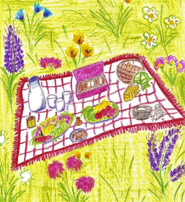 – Устроим пикник! – весело предложил лесник, доставая из багажника большое покрывало. Он пошёл на поле и расстелил его на мягкой траве. Туда же ребята потащили сумку с провизией. В приготовленной мамой сумке оказалась даже одноразовая посуда, так что устроились красиво.