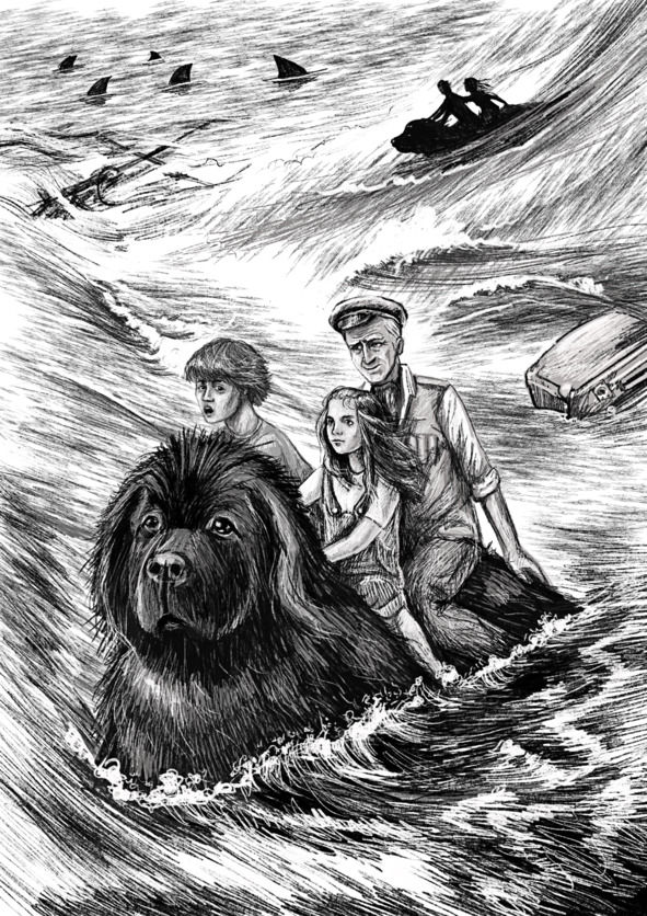 Мако пребывали. Я живо усадил себе на спину Дарио и дрожащую от ужаса Палому. Затем, не без труда, закинул и Мартина. Остальных разве что на буксир… Я уже протянул им свой хвост, как хищницы-мако вспугнули волну. Мать и отца Ортисов понесло к скале Призрачных ласточек, крошечному серому осколку, посреди океана. Я взвыл от обиды. Но вдруг появились они: бывалый Пират, взволнованная Конфетка, проказник Пушкин, хмурый Баро-Волк, Карузо, Сигара и старый боец – Тайсон! Мои братья и как вовремя! Старина Тайсон лихо ушёл под волну и бесстрашно бросился на акул. Кого-кого, а Тайсона хищницы-мако на дух не выносили… Однажды этот дог хорошенько припугнул их королеву Мегалодонну, оставив на её хвосте фирменный отпечаток своей исполинской челюсти.
