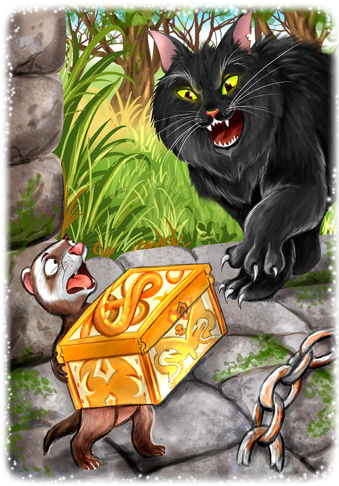 Он прихватил шкатулку и со всего маху бросился наутёк. Бежать только на задних лапах, по-человечески, было ох как нелегко, к тому же шкатулка была очень тяжёлой, а змеи на ней извивались и злобно шипели. «Хорошо хоть, что они нарисованные и не могут укусить», – подумал хорёк. Проблем и так было по самое горло, над ним хищно кружил ворон и громко каркал, призывая всех обитателей замка на помощь.