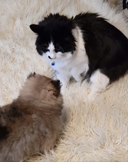 Кузьма от неожиданности подпрыгнул, шерсть у него встала дыбом и он даже зашипел. Комочек, не боясь, стал бегать вокруг кота, как бы знакомясь с ним. И тут кот понял, что у него теперь есть младший друг. С кем можно поиграть и побегать.